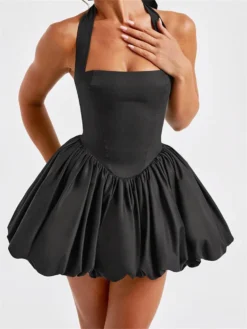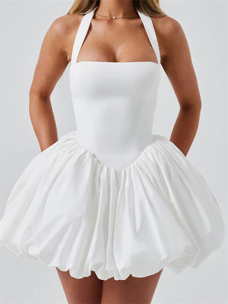 Women Sleeveless Halter Dress Summer Casual Tie up Backless Corset Bubble Party Dress for Beach Club Streetwear