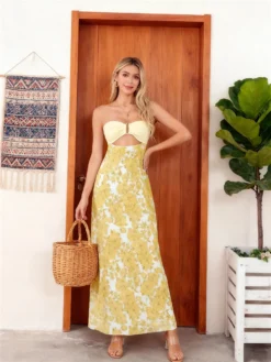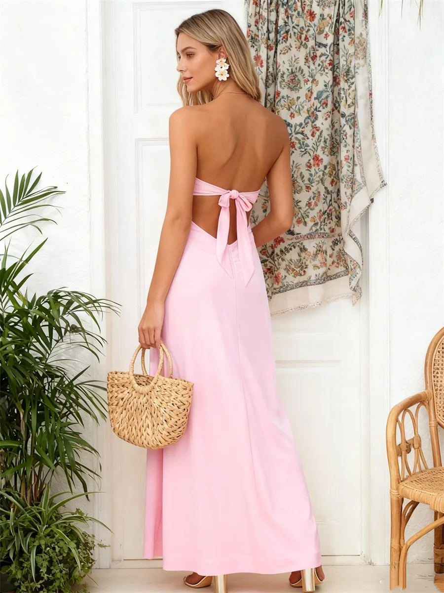 Strapless Dress for Women Stylish Hollow Out Solid/Floral Print Bow Tie Back Sleeveless Tube Long Bodycon Dress